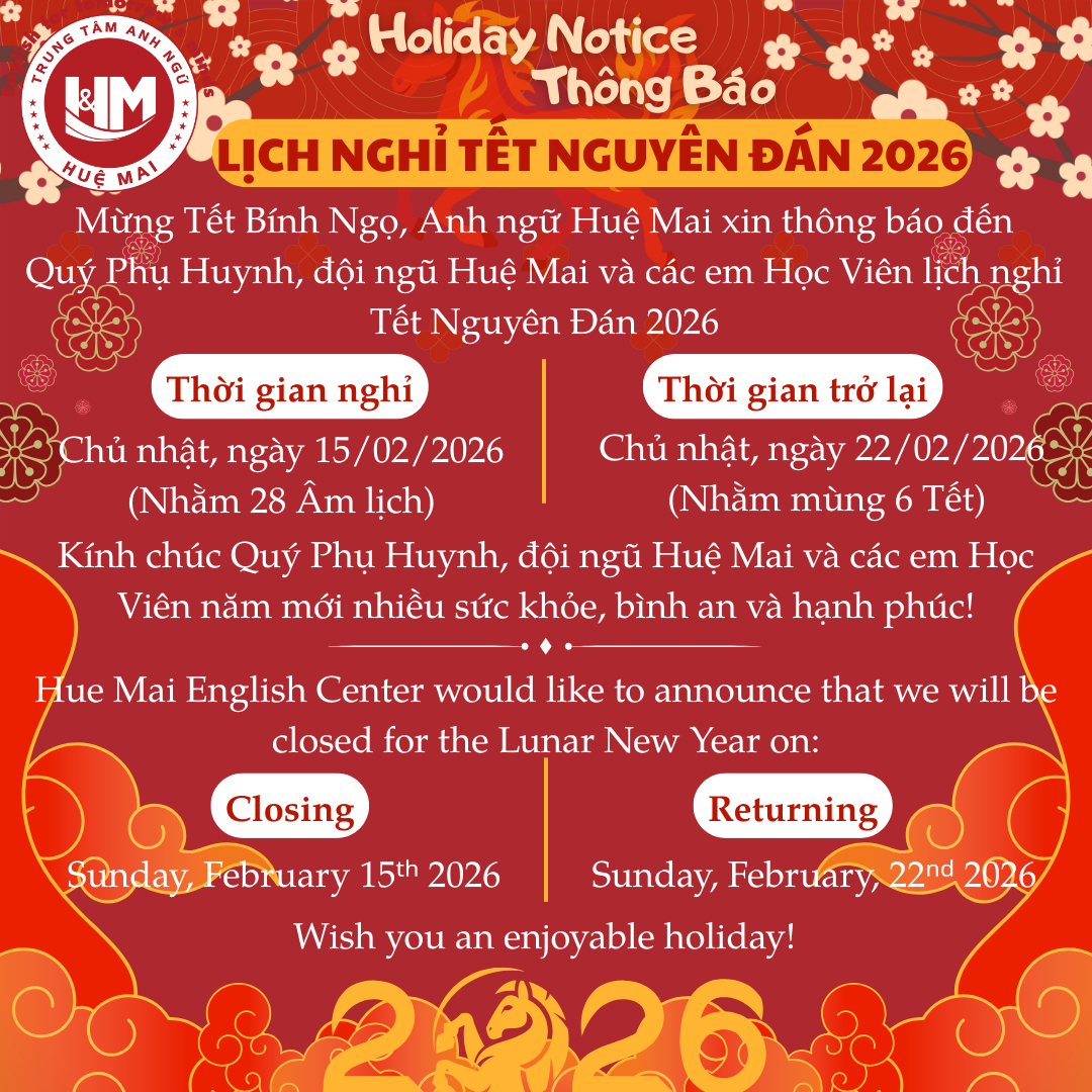 Anh ngữ Huệ Mai xin trân trọng thông báo đến Quý Phụ huynh và các em học viên lịch nghỉ Tết Nguyên Đán – Xuân Bính Ngọ: